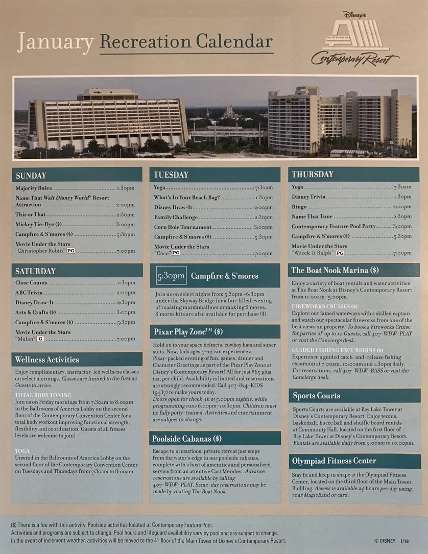 Contemporary Resort has a relatively robust menu of activities. The schedule is pretty typical of the resorts—campfires, movies, pool games.