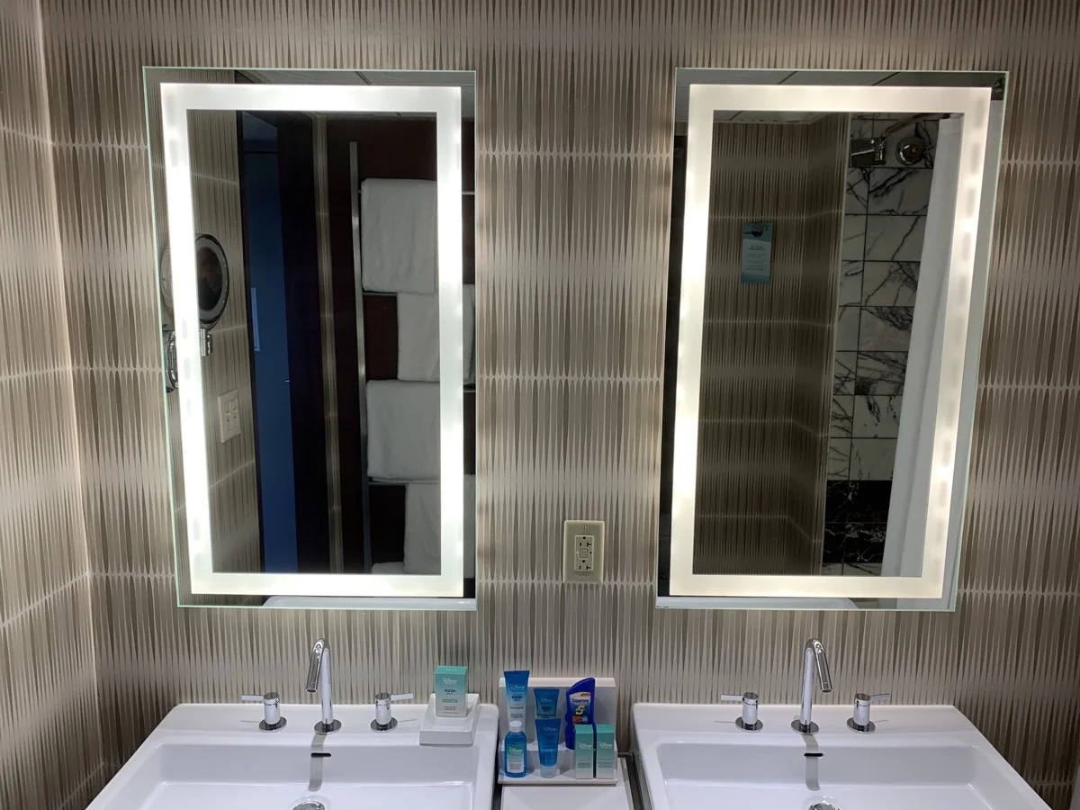 But there were three bad aspects. The lighting in the bathroom was really insufficient. Let's be clear—neither of us is a diva. I look like I get dressed in the dark every day. But even I immediately felt like the bathroom was dark.